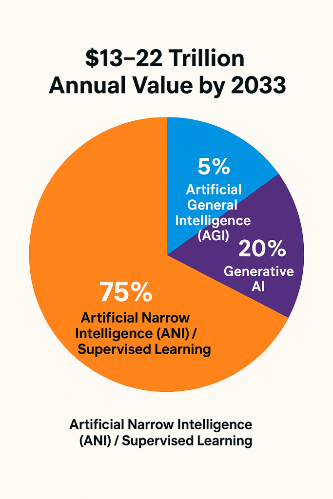 There’s no doubt that Artificial Intelligence (AI) is the technology of our time, promising to reshape industries and create unprecedented economic value. But beneath the headlines and hype, what exactly is driving this revolution, and where is the estimated $13 to $22 trillion in annual value going to come from by 2033?