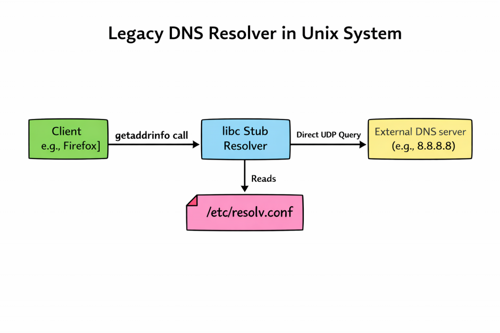 OpenBSD, famous for its “secure by default” stance, includes modern, secure DNS software like unbound in its base installation; its default system resolution behavior remains classical. Unless the OS is explicitly configured to use a local caching daemon, applications on a fresh OpenBSD install still read /etc/resolv.conf and talk directly to external servers. They prioritize a simple, auditable baseline over complex automated magic.