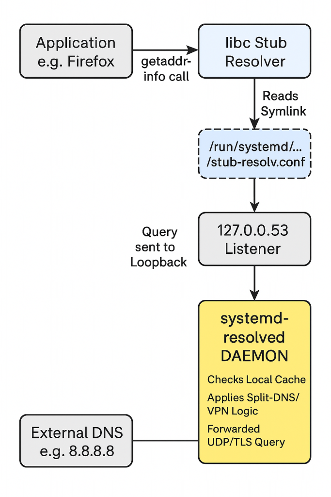 In modern linux systems, systemd-resolved acts as a local middleman, a DNS broker that manages configurations from different sources dynamically. The /etc/resolv.conf file is no longer a real file; it’s usually a symbolic link pointing to a file managed by systemd that directs local traffic to a local listener on 127.0.0.53.